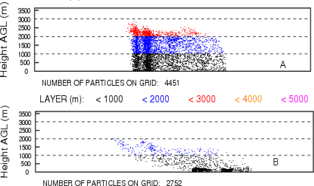A total of 500 particles or puffs are released during one release cycle with a maximum of 10000 particles permitted to be carried at any time during the simulation (Table 3). The time step is chosen such that a particle transits 0.75 grid cell distance in one advection step. The turbulence mixing is computed using a short-range diffusivity approach based upon vertical stability estimates. The turbulent velocities are computed directly from the stability parameters, either the heat and momentum fluxes, if available, or derived from the wind and temperature profiles. The puff dispersion is treated as linear with time. Ground level concentrations are computed as averages for the lowest 50 m within each horizontal grid cell.