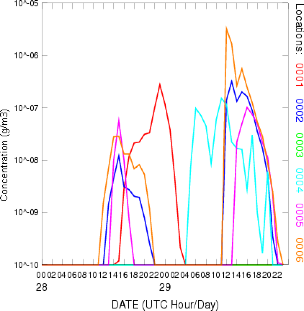 Model calculations show diurnal variation in concentration. Concentration at most locations indicates a bimodal distribution with a peak in concentration during stable morning and in the afternoon times. The concentration peaks occurred at slightly different times at different locations due to the variation in the visiting time of plume at different locations.