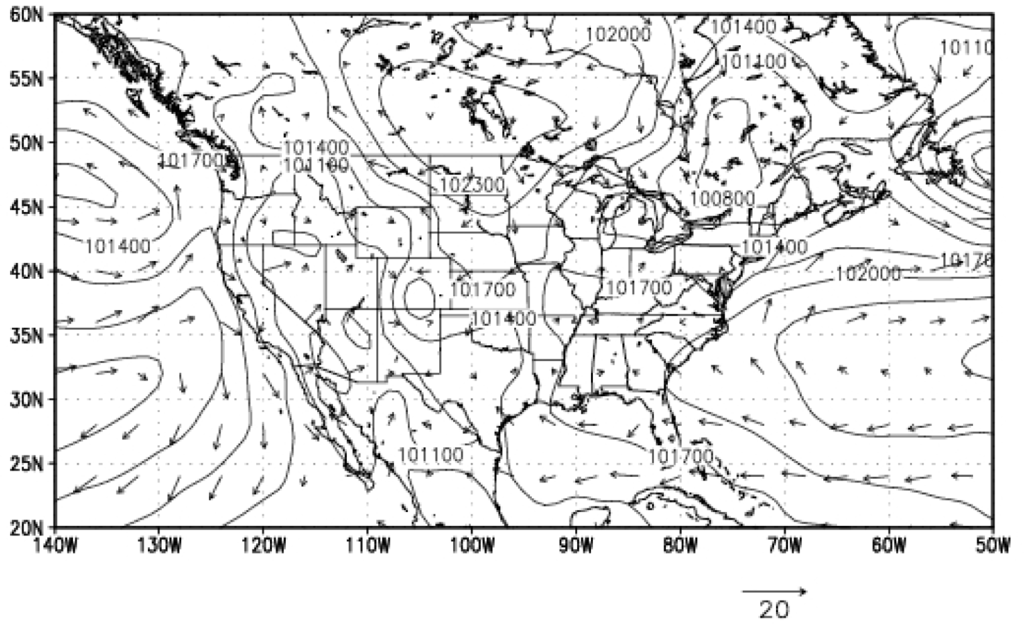 The synoptic weather chart drawn from the FNL analysis during the experiment time is shown in Figure 3. It shows the sea level pressure and winds for 28 June 2007.