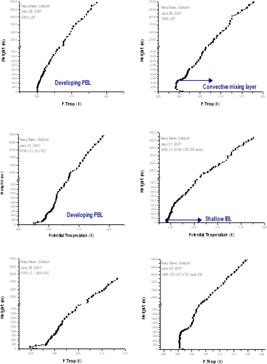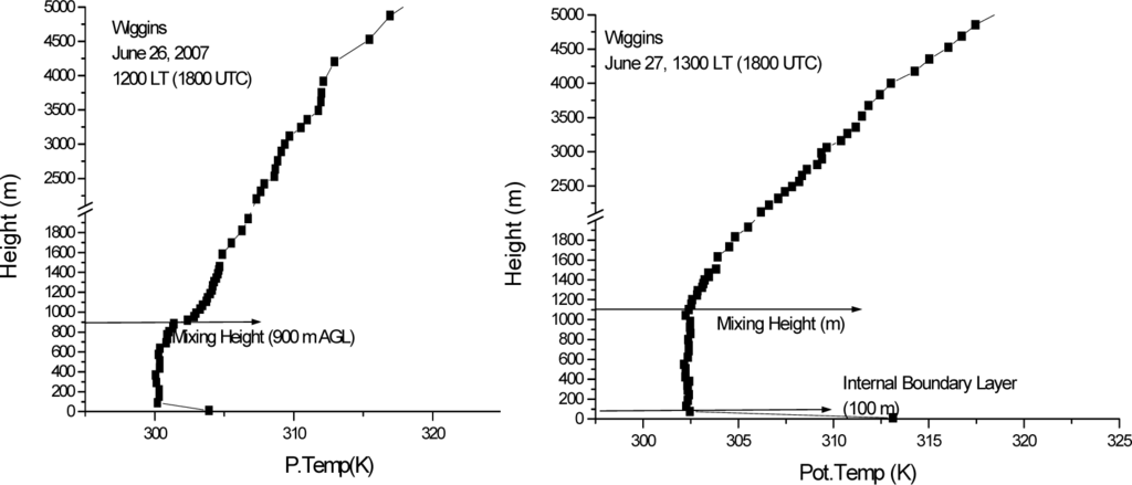 At Wiggin’s air base the profiles indicate formation of steep unstable layer and a neutral layer during the convective daytime conditions. The depth of the unstable layer is about 100 m. The mixing layer depth reaches about 900 m on 26 June, and 1100 m on 27 June (Figure 6.) as the cloud cover decreased on 27th.
