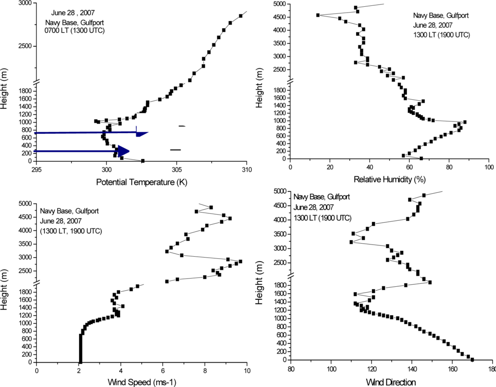 Authors thank for the support of the Atmospheric Dispersion Project (ADP) funded by the National Oceanic and Atmospheric Administration through the U.S. Department of Commerce (Silver Springs, MD); Contract #NA06OAR4600192. The authors thank the National Center for Atmospheric Research (NCAR) for the analysis data and the Mississippi Department of Environmental Quality for providing the emission data of the elevated point sources used in the study. Special thanks are due to the Navy Sea Bee Base for providing the GPS Sonde equipment and for the support in conducting the meteorological experiment. Authors gratefully acknowledge the NOAA ARL for the tower observations at Harrison and for providing the HYSPLIT dispersion code used in the study.