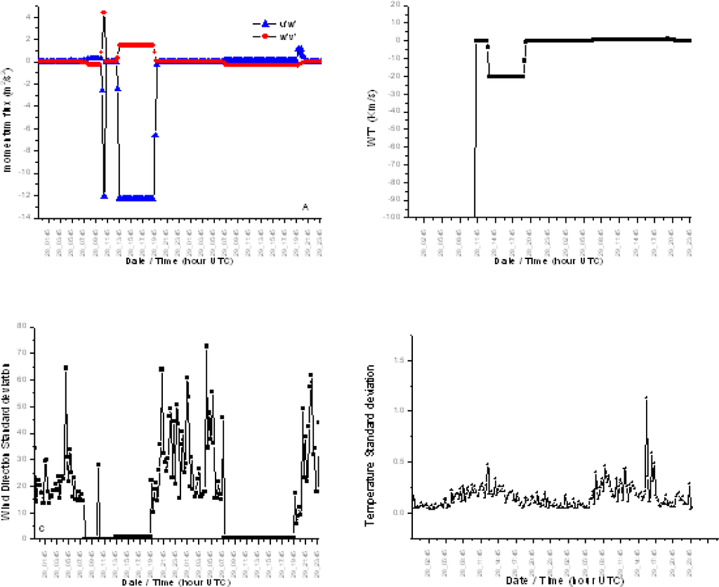 Diurnal trends of u/v momentum flux (A), eddy heat flux (b) and wind direction standard deviation (c) and temperature standard deviation (d) at Harrison site.