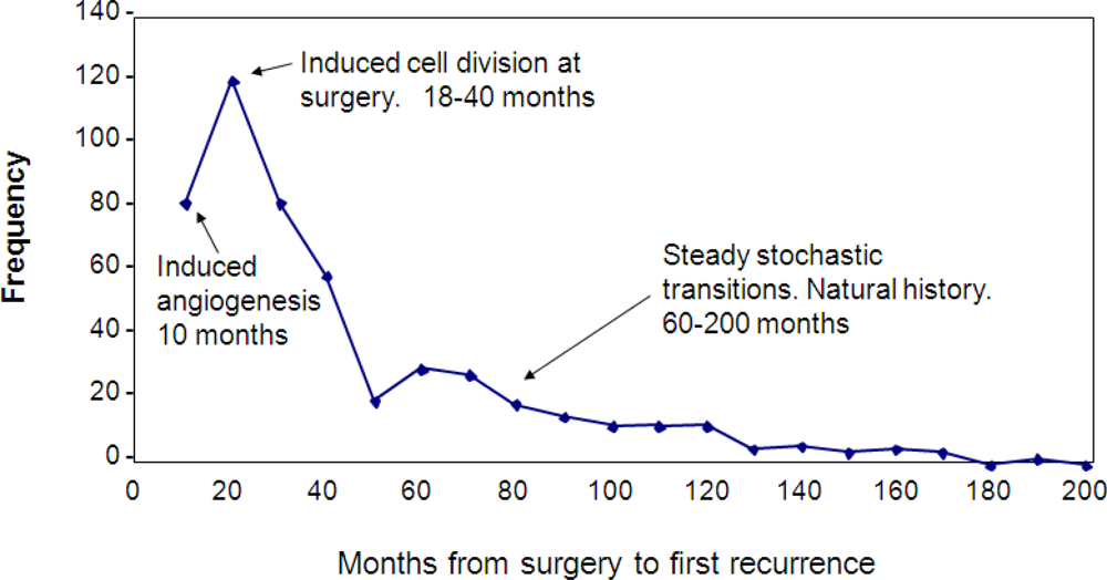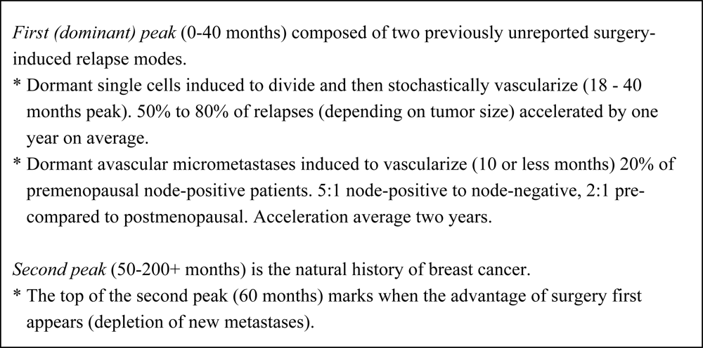 Figure 1 shows the Milan data, together with our explanation of the various relapse modes. The first peak is clearly dominant and includes two previously unreported relapse modes. The earliest relapses (within 10 months of surgery) are avascular micrometastases that are induced into angiogenesis by surgery. The relapse events in the remainder of the first peak are the result of single dormant malignant cells that are induced into division by surgery and then pass through angiogenesis stochastically. Mechanisms proposed for this first peak are growth factors produced in response to surgical wounding and also reduction of antiangiogenic factors due to removal of the primary tumor. After a nadir at 50 months, the second peak that extends out to 200 months is seen. This second peak is the natural history of the disease. Events in the second peak are the result of stochastic transitions from one state to the next in the growth progression as proposed. The top of the second peak marks the point at which the benefits of surgical removal of the primary tumor are first seen. Until that time, surgery has produced accelerated relapses.