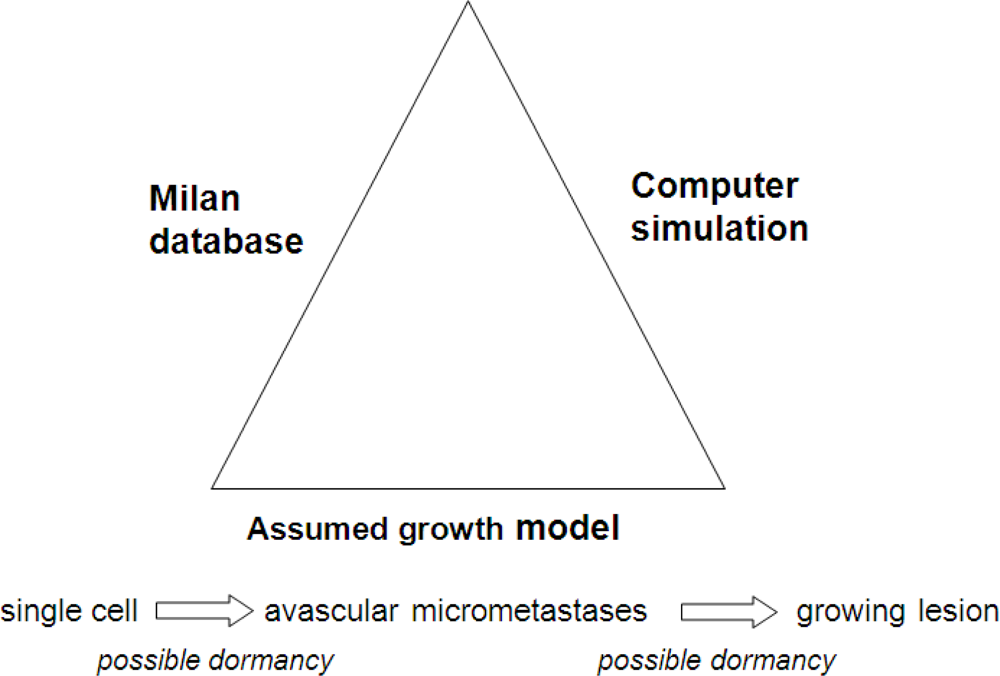 The outlines of our algorithmic approach are shown in Figures 2 and 3. The three necessary ingredients needed to perform an algorithmic study are shown symbolically in Figure 2. First there are the clinical data from the Milan National Cancer Institute on follow-up of 1,173 patients after removal of the primary tumor. The growth model chosen allows the possibility, but does not insist that tumor growth can be interrupted for variable periods of time at the single cell level and also before angiogenesis occurs. This growth model is the sum and substance of the assumptions in this project. The third ingredient is a stochastic computer simulation.