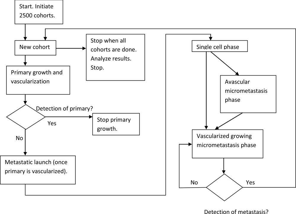 The computer program used to determine numerical values of growth rates and transitions from state to state is shown as a flow chart in Figure 3. It is meant to simulate the full history of early stage breast cancer for a large cohort of subjects. In the simulation, breast cancer starts with one malignant cell in the primary tumor. The primary is allowed to grow. Once the primary has exceeded approximately 1 mm diameter and until it is detected and removed, metastatic cells are shed into distant sites where they lodge and grow until one is detected as a metastatic relapse. The shedding process occurs most strongly for patients with a high risk of relapse such as having positive lymph nodes. As the primary tumor gets larger, more metastatic cells are disseminated. Thus the risk of relapse also increases with the size of the primary tumor at detection, consistent with clinical data. For some patients, there are no metastatic cells shed and obviously they never relapse. Dormancy of micrometastases is allowed but not required at the single cell state and also prior to angiogenesis. Metastatic shedding and exits from dormancy are simulated as stochastic events. This process is conducted for 2,500 separate individual cohorts. Using a population this size produces reasonable repeatability of results. Not coincidentally, large clinical trials have approximately that number of subjects. The single most important result was that transitions needed to be temporarily augmented at the time of surgery in order to explain the first peak in the bimodal data. Results of using this algorithm are summarized in Figure 4.