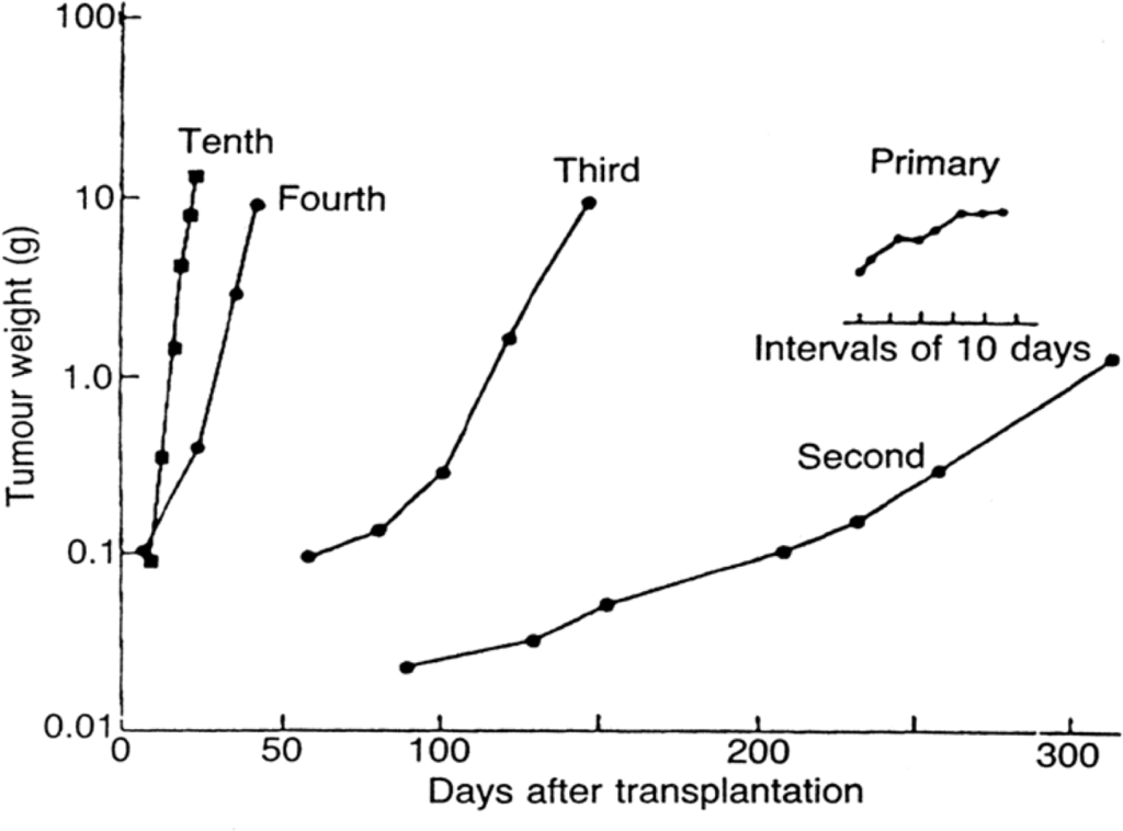 Data from Steel [27] are shown as modified. This demonstrates how a multipassaged animal model tumor originally showing erratic growth becomes a reproducible and rapidly growing tool suitable for experimental use.