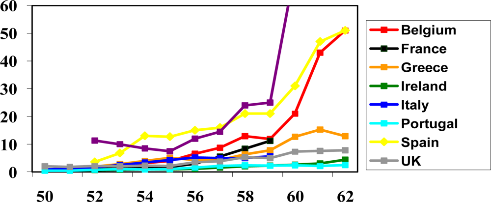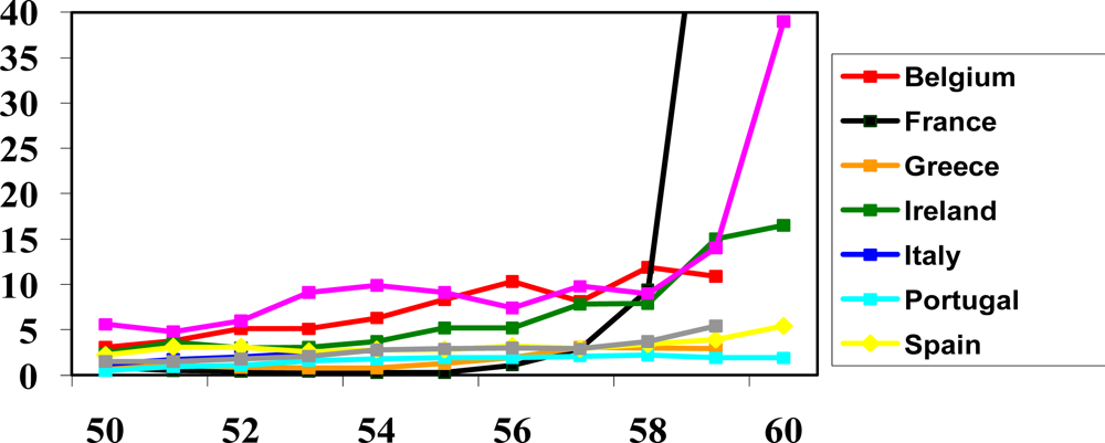 For the countries used in our analysis [] find the highest tax force, and hence the greatest financial incentive to retire early, in Italy followed by Belgium, with lower levels in France, then the UK and Spain. These countries, with the exception of Spain, show little effect of the discrete acute health shock but some effect of the lagged latent health stock suggesting that chronic ill-health may have more influence on the retirement decision. [] presents the average implicit tax rate over the five years from age 60: this is less than the OECD average in Ireland, Portugal and the UK and above the average in Belgium, France and Spain. So the latter have the highest incentive to retire at 60 rather than later. This is supported by a pooled analysis of data combined across seven countries and including additional country-specific regressors representing the standard retirement age, average replacement rate and average implicit tax rate at 60 and 65 years (Table 5). Data on these variables were reported in [].