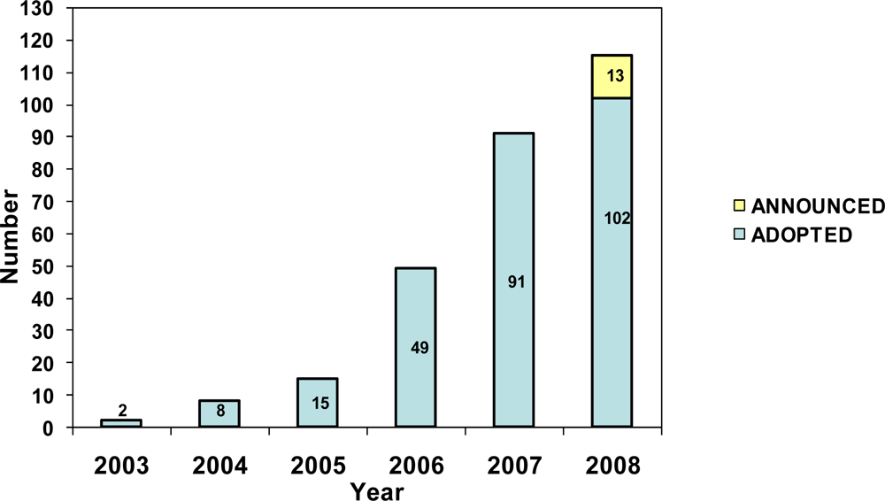 Data from North Carolina show rapid passage of 100% TFHC policies statewide in a short period of time. In 2006, the North Carolina Hospital Association (NCHA) and NC Prevention Partners (NCPP), with support from The Duke Endowment, created the Healthy Hospital Initiative to assist all North Carolina hospitals in adopting 100% TFHC policies and also to provide comprehensive cessation support to hospitals [6]. Of the state’s acute care hospitals, 102 passed TFHC policies from 2005 to 2008 (Figure 1). As of May 2008, another 13 had announced policies scheduled for implementation in 2009.