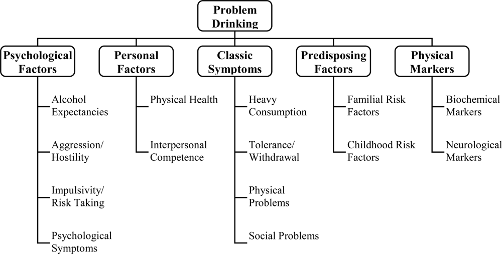 RIASI items loading on factors are shown in the Appendix. The proportion of variance explained by each factor corresponds to the eigenvalue and equals the sum of the squares of the factor loadings. The first component had the highest eigenvalue (5.70). The aim is to account for the maximum amount of variance with the smallest number of components. An 8-factor solution explained 31% of the total variance. The 8-factor solution retained showed substantial correspondence with the conceptually-defined items originally included by Nochajski et al. [19] (see Figure 1). The first factor included five items reflecting depressed mood, three reflecting anxiety, two reflecting hostility, and one reflecting sensation seeking. Since this factor seemed to reflect negative affect more generally, rather than depressed mood specifically, it was labeled Negative Affect. The second factor extracted loaded highly on items reflecting seeking or undertaking risky things for fun, or tendencies towards more impulsive behavior, therefore, labeled Sensation Seeking. The third factor items mainly reflected higher quantities of alcohol consumed on drinking occasions (largest number of drinks consumed in a 24-hour period, how many drinks usually consumed on a drinking occasion), other indicators of heavier drinking (more drinking days per week, money spent on alcohol per week), and one item suggesting higher tolerance for alcohol (how many drinks before feeling the effects). This factor was labeled Alcohol-Quantity. The fourth factor had four items; three came from a pilot lie scale [19], which identified behaviors that reflect a response pattern of endorsing the socially desirable response, even though it would be an unlikely response. For example, item 51 states, ‘I sometimes feel resentful when I don’t get my way.’ A response of ‘no’ on this item is considered to reflect a desire to provide a socially appropriate response, as opposed to an honest or accurate response. One item that was originally included to reflect hostility also loaded on this factor. This factor was labeled Social Conformity. The fifth factor items reflected criminal activities, high risk driving, and a history of being injured, which reflect a willingness to take risks or disregard societal rules, therefore labeled High Risk Lifestyle. The sixth factor labeled Alcohol Problems included items on symptoms of alcohol dependence or loss of control (e.g., I hardly ever drink more than I plan to), and acute and chronic consequences of excessive drinking (e.g., I was referred for a liver test, or a blood test for liver enzymes), and one item reflecting depression, which is often associated with excessive drinking. Higher scores on this factor reflected lower alcohol problem levels. The seventh factor labeled Interpersonal Competence appeared to reflect willingness and ability to act based on one’s own judgment. Items in this factor suggested assertiveness, internal locus of control, and an assertive attitude. The eighth factor extracted included items that reflected alcohol-related problems in family members, and was therefore labeled Family History. As with the Alcohol Problems factor, higher scores on the Family History factor reflected lower likelihood of being positive on family history measures.