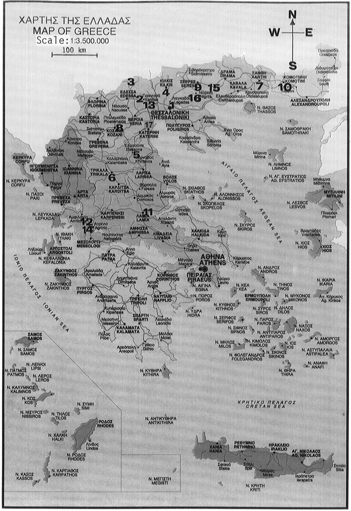 A map of Greece showing the sampling locations of the tobacco leaves (Table 1).