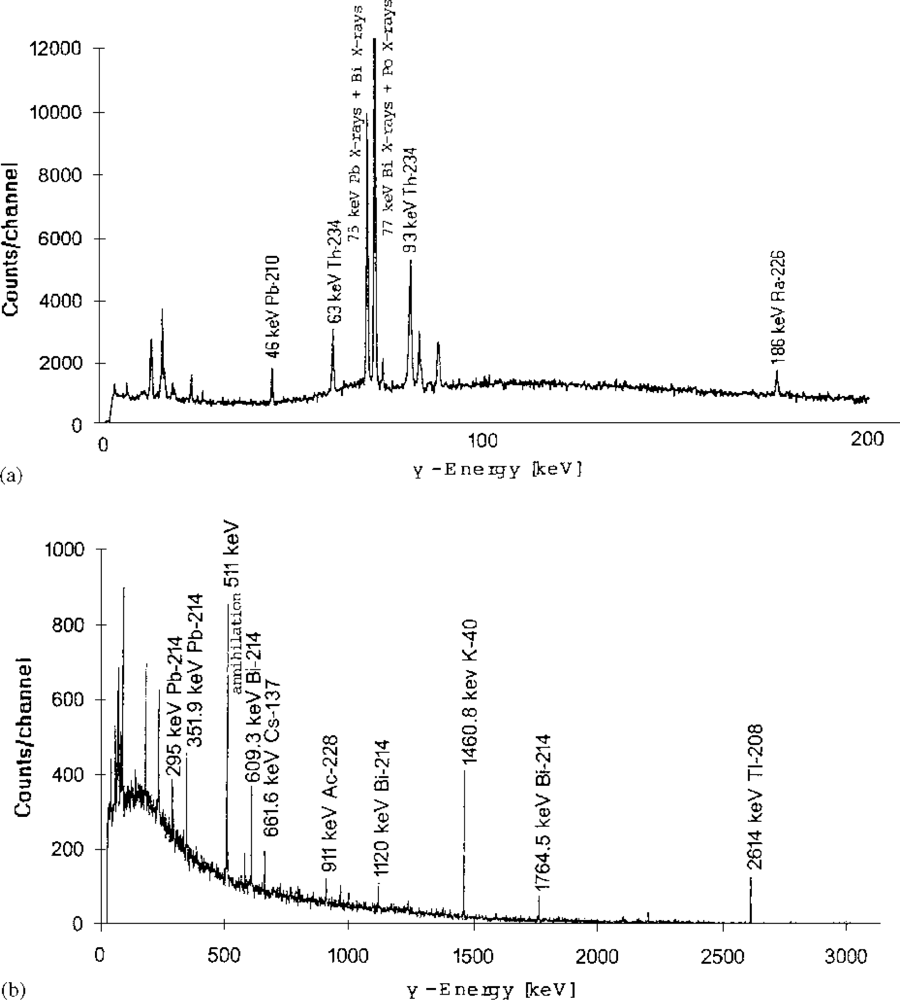 Gamma-ray spectrum of tobacco leaves. (a) Gamma photon energies ranging up to 186 keV obtained with planar detector. (b) Gamma photon energies ranging up to 2614 keV obtained with coaxial detector.