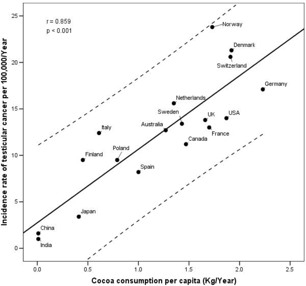 Correlation between TC incidence rates for 20–34 years-olds (1998–2002) and per capita cocoa consumption (1965–1980) in 18 countries.
