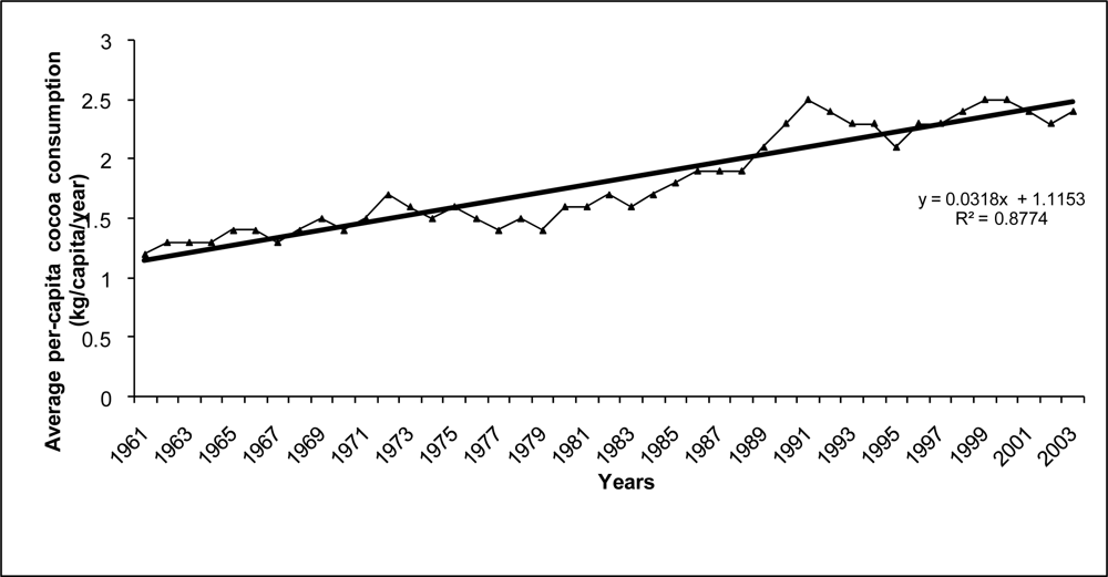 Trend in average per-capita consumption of cocoa (1961–2003) in nine European countries (Denmark, Finland, Norway, Sweden, U.K., Italy, Spain, France and Switzerland)