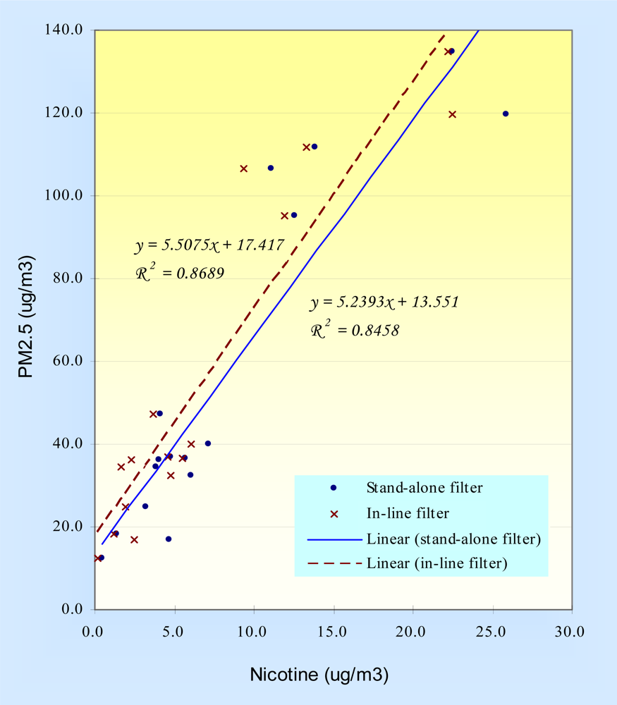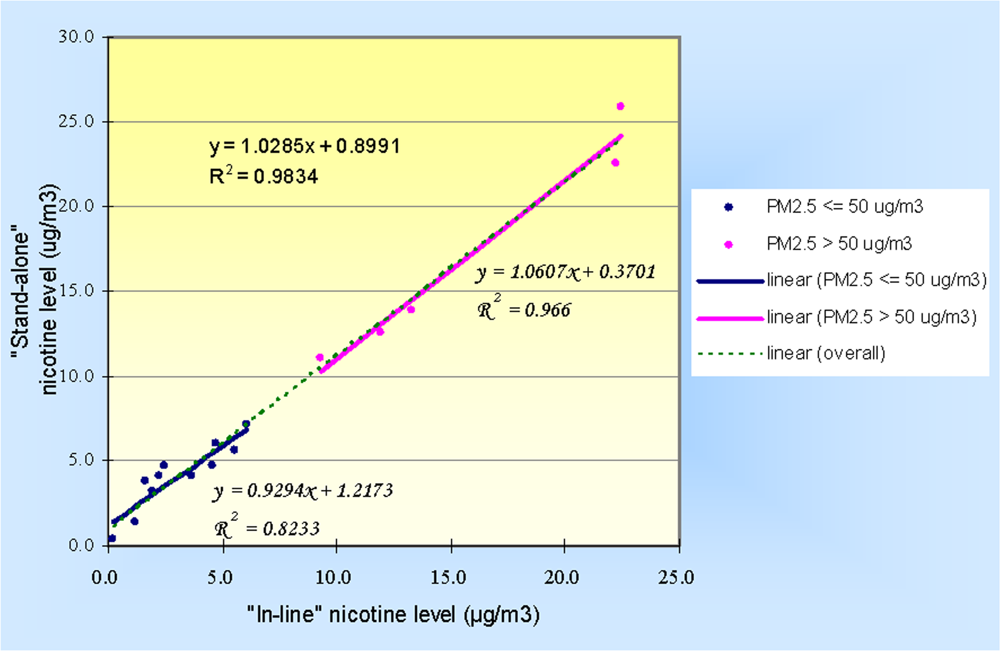 | PM2.5 conc. | “Stand-alone” nicotine conc. | “In-line” nicotine conc. | Nicotine conc. difference [(“Stand-alone”) – (“In-line”)] a | |||||||||||