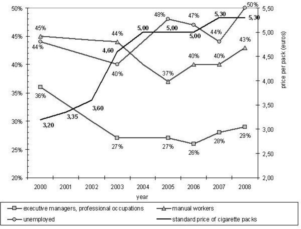 Figure 1 displays the trends in smoking prevalence among executive managers and professional occupations, manual workers and the unemployed, as well as the evolution of the standard price of cigarette packs, between 2000 and 2008.