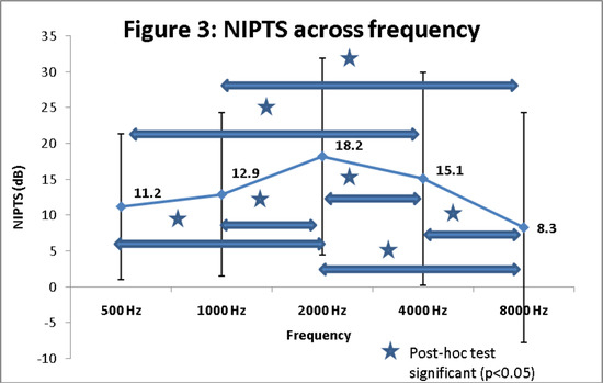 Noise-induced permanent threshold shifts (NIPTS) were computed from retrospective audiometric analyses by subtracting aging effects on hearing sensitivity in sixty-eight patients with bilateral sensorineural hearing loss who reported significant occupational noise exposure histories. There were significant effects of age on NIPTS but no significant gender- or ear- differences in terms of NIPTS. The NIPTS at 2,000 Hz was found to be significantly greater than NIPTS at frequencies 500 Hz, 1,000 Hz, 4,000 Hz, and 8,000 Hz. Defined noise notches were seen in the audiograms of 38/136 (27%) ears with SNHL. Results support models that suggest interactive effects of aging and noise on sensorineural hearing loss in ears with occupational noise exposure. Full article