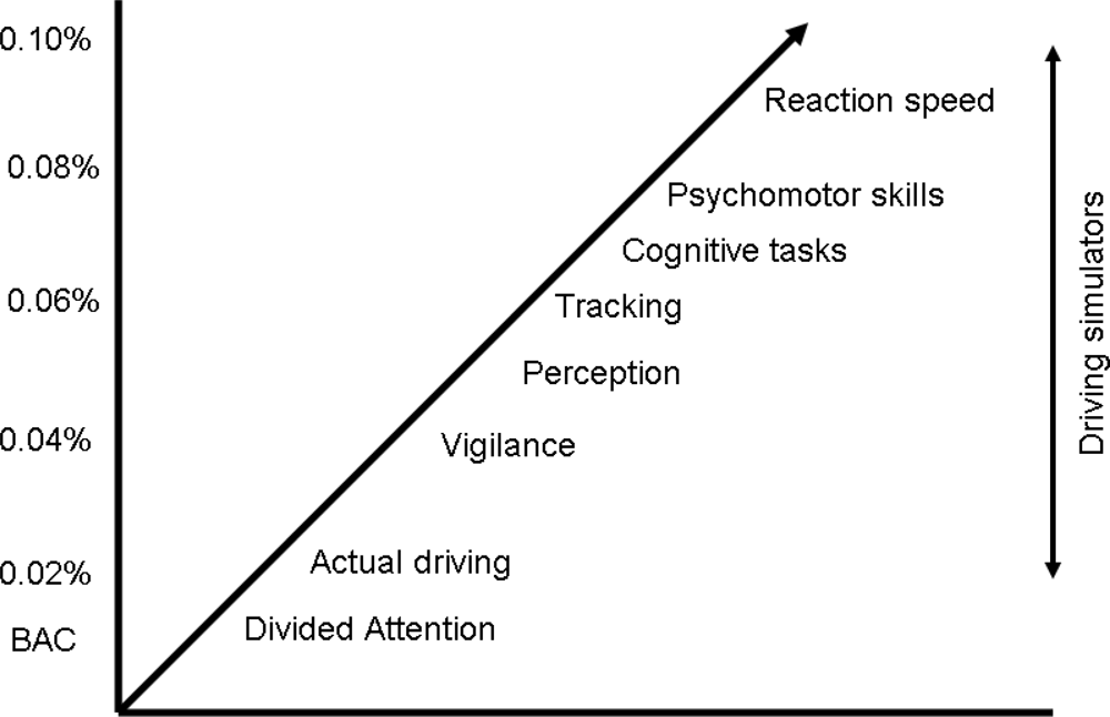 There are various methods to examine driving ability and assess the effects of psychoactive medication on traffic safety. Epidemiological studies provide evidence about the (increased) risk of becoming involved in traffic accidents when using psychoactive medication. Although this is important information, it is gathered after accidents have happened. Ideally, one would like to have this information beforehand in order to prevent driving under the influence of these drugs. A limitation of most epidemiological studies is that the statistical analysis is based on groups of drugs instead of individual drugs. This is unfortunate, because within drug groups the effects of individual drugs on driving ability can differ significantly. Many researchers use laboratory tests to examine driving related skills and abilities such as reaction speed, working memory and psychomotor functioning. Although these skills and abilities are all of great importance to operating a vehicle it has been proven that it is very difficult to predict actual driving performance from these tests [4]. This is caused by the fact that these skills and abilities are tested in isolation, whereas in real driving they are integrated and performed simultaneously. Also, the extent of impairment of individual skills and abilities differs greatly after administration of a psychoactive drug [5]. This is illustrated by Figure 1, showing the blood alcohol concentrations (BAC) at which different skills and abilities become impaired.