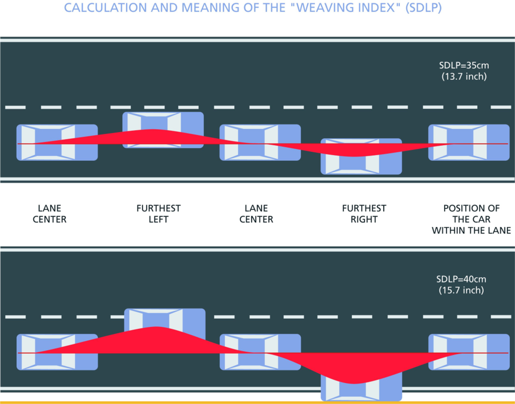 Standard Deviation of the Lateral Position, SDLP. Increased weaving of the car (higher SDLP values) represents reduced vehicle control and may result in out of lane excursions.
