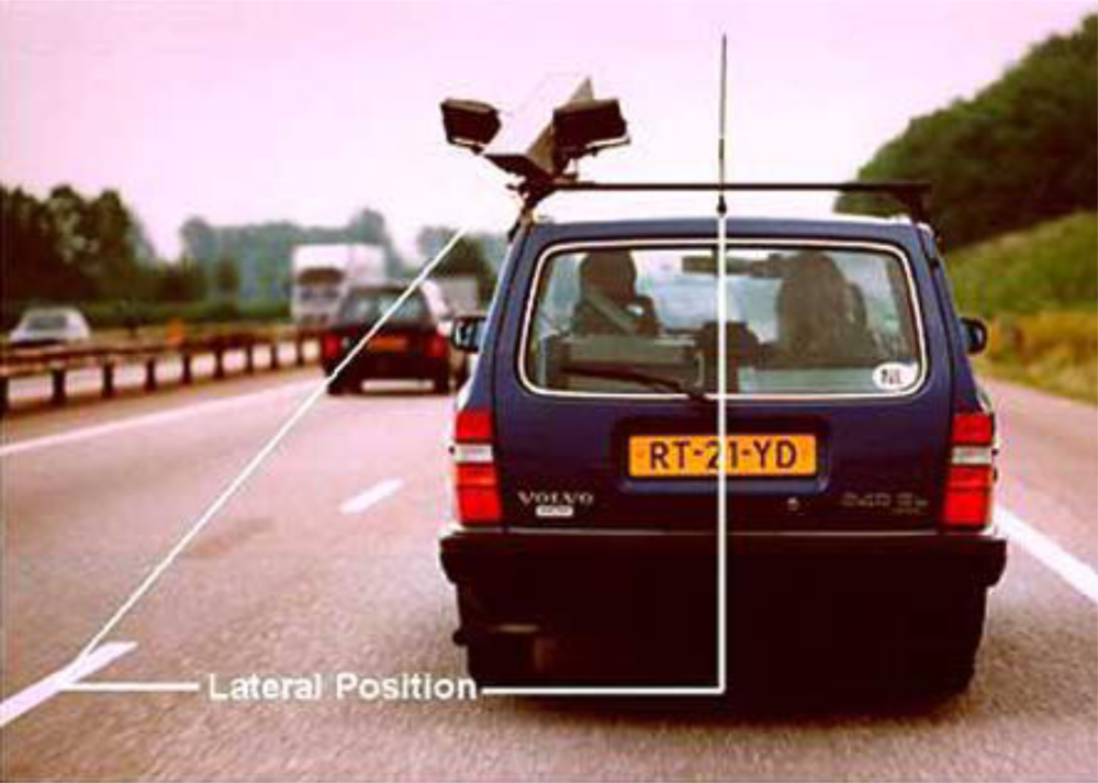 The instrumented car.Note that the camera for lateral position measurements is equipped with two infrared lights, to enable recording during the night and dark weather circumstances. Adapted with permission from reference [12].
