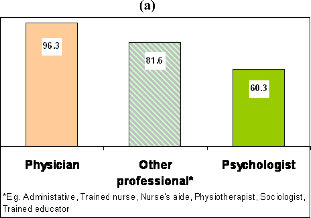 The breakdown of the staff and their professional qualification working at the SCS is shown in Figure 3. The highest percentage of staff were physicians (96.3%) followed by other professionals (81.6%) such as administrative personnel, nurse, nurse assistant, physiotherapist, sociologist, trained educator and clinical psychologists (60.3%) (Figure 3a). It is worth mentioning that majority of SCS (96.6%) were led by at least one physician who operated in a team with clinical psychologists (59.2%) and other professionals (30.7%) and only in 6.4% of SCS the physicians were working by themselves (Figure 3b). In fact, an average of three different specialists was the most representative combination of SCS staff (Figure 3c).