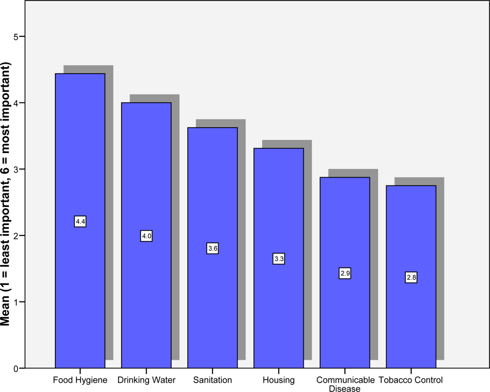 Figure 1 shows the mean ranking given to six environmental health issues (6 = most important, 1 = least important). It can be seen that issues prioritised as most important were food hygiene (mean = 4.4) and drinking water (mean = 4.0). Tobacco control was given the least important rating in terms of priority (mean = 2.8). Respondents who stated that their own IFEH organisation had a policy on tobacco control gave higher priority to tobacco control than those who did not have a policy (mean = 3.86 compared to 2.36). These differences were statistically significant (Independent T test, t = −2.077, df = 16, p = 0.054). There were no significant differences in the priority given to tobacco control for countries within the European Union and those outside the European Union (Mean = 3.23 compared to 2.63, Independent T Test, t = 0.735, df = 16, p = 0.473).