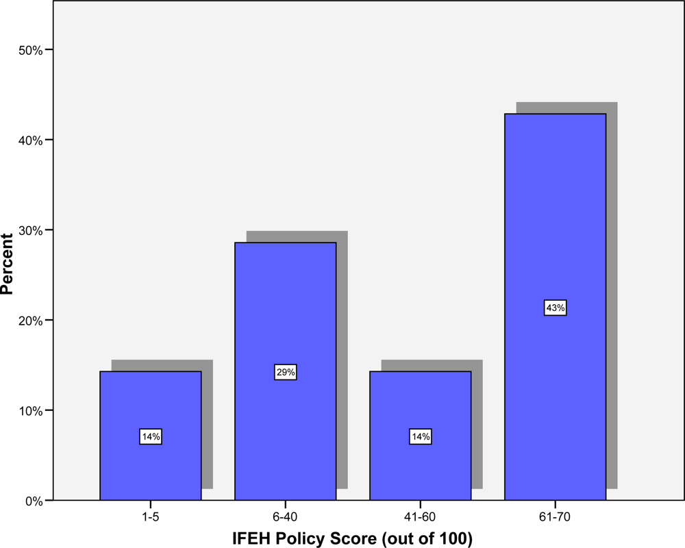 For the 7 countries that had a policy on tobacco control, Figure 2 provides an overall policy score out of 100, based on the Code of Practice for Professional Organisations [9] (weighted score of the 23 items shown in Table 4). It can be seen that 43% scored between 61 and 70 out of 100, while 43% scored 40 or less and 14% scored between 41 and 60. No IFEH policy scored over 70 out of 100. The mean score was 45.97 (median = 52.17, SD = 24.19).