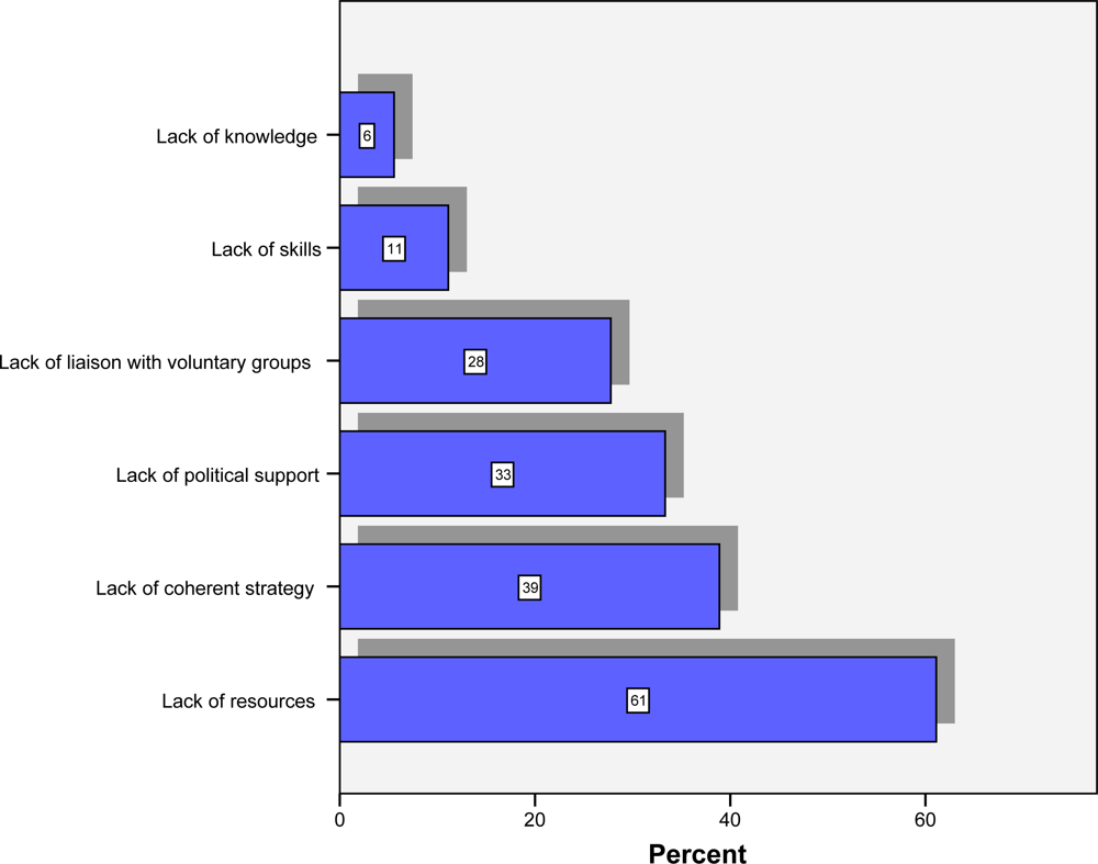 Figure 3 shows that the main obstacles for IFEH organisations in terms of addressing tobacco control were lack of resources (61%), lack of coherent strategy (39%), lack of political support (33%), and a lack of liaison with voluntary groups (28%). Almost a third of respondents (33%) also stated other obstacles including priority being given to food hygiene (33%), no national legislation (17%), and interference from tobacco manufacturers (17%).