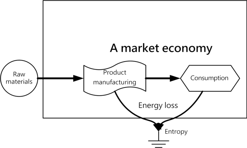 In order to comply with the principles of energy self-sufficiency, a bio-hydrogen based autonomous house should complete a self-sufficiency cycle encompassing energy production, storage, distribution control, load applications, recycling, disposal and reuse. A life-support environment refers to an ecosystem in the earth’s biosphere that can meet the physiological needs of living organisms. Economic systems must obtain life-support functions from the natural environment and otherwise cannot survive. The basic theme of the sustainable development concept is that the effects of human actions should be subject to certain constraints so as not to destroy the diversity, complexity and functions of ecological life-support systems [26]. As a consequence, an effectively-functioning autonomous system based on a human society must integrate ecological and economic aspects if it is to realize the ideals of sustainable development. Figure 3 shows that the world’s resources and energy will be quickly exhausted due to the effect of entropy in a market economy emphasizing only the process encompassing only raw materials, product manufacturing and consumption [27]. Figure 4 shows how sustainable development must integrate ecology and economics, emphasizes recycling and reuse after consumption and relies on a self-sufficiency cycle to reduce energy consumption and slow entropy.