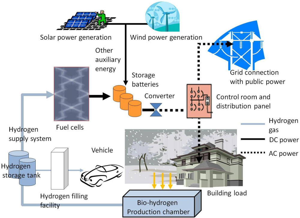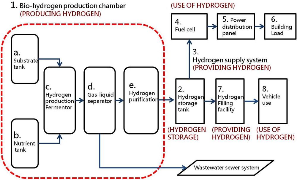 In accordance with the energy self-sufficiency cycle, a building can be seen as a means of converting mass to energy and must a cycle consisting of energy production, storage, distribution control, load applications, recycling, disposal and reuse. A building should also possess a support system including: (1) a bio-hydrogen production chamber, (2) a hydrogen storage tank, (3) a hydrogen supply facility, (4) fuel cells, (5) other auxiliary alternative energy sources (solar power, wind power, etc.), (6) storage batteries, (7) a converter, (8) a control room and description panel and (9) the building’s power load. If hydrogen fuel cell vehicles are used in the future, then (10) a hydrogen filling facility can be added. If the amount of power generated by the building may exceed its consumption and can be provided to other local users, then a grid connection to the public power supply can be added (Figure 5). The biology-hydrogen production chamber consists of five main components: (a) substrate tank, (b) nutrient salt tank, (c) hydrogen production fermentation tank, (d) gas-liquid separation tank and (e) a hydrogen purification device. The bio-hydrogen real-time power generation system includes hydrogen production, hydrogen storage, hydrogen supply and hydrogen use processes (Figure 6).