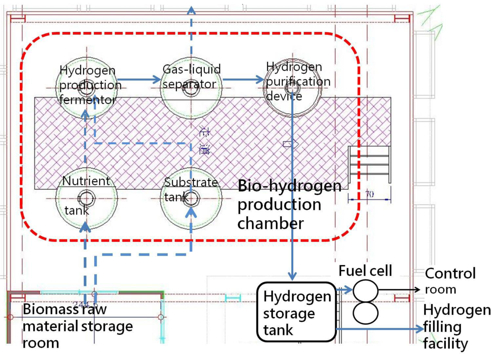 According to information from the Taiwan Power Co. [28], statistics for the most recent five years indicate that a household needs 3–4 kW of installed capacity. According to Lin [29], a 3.2 m3 hydrogen production fermentation tank can meet the power needs of an ordinary family. If, however, biomass is selected as a raw material, variables such as processing and conversion methods and environmental factors (temperature, humidity and pressure, etc.) will affect the rate of hydrogen production and hydrogen density. The installation of a hydrogen storage tank can resolve the problems associated with variable production rate. Excess hydrogen can be stored and used at times when the amount generated is insufficient. According to the bio-hydrogen real-time power generation system, developed by Feng-Chia University, during 300 days of use, each liter of the bio-hydrogen production tank generated 1.15±0.08 liters of hydrogen per hour. When small LEDs were hooked up to the system operating at ambient temperature (25°C), the current and voltage were 0.38 A and 2.28 V respectively. According to the formula power = current × voltage, the system generated an average of 0.87 W (0.38 × 2.28 = 0.87 W). It can therefore be conservatively estimated that a hydrogen production fermentation tank with a volume of 3,222 L (≈3.2 m3) will be needed to accommodate an average household load of 3 kW ((3000/0.87) ÷ (1.15–0.08) = 3,222 L ≈ 3.2 m3). This is roughly the size of an ordinary commercial septic tank (2–3 m3). Taking Feng Chia University’s experimental bio-hydrogen production plant as an example (Figure 7), the five main components of the bio-hydrogen production chamber (substrate tank, nutrient salt tank, hydrogen production fermentation tank, gas-liquid separation tank and hydrogen purification device) have volume ratios of 2:2:1:1:1. As a consequence, the bio-hydrogen production chamber will have a total volume seven times that of the hydrogen production fermentation tank, i.e. 22.4 m3. Assuming an ordinary house with vertical clearance of 2.5 m, approximately 15 m2 of equipment area will be needed (assuming that the tank is 1.5 m in height). If passageways and other equipment occupy one-fourth of the bio-hydrogen production room, then the room will require a total usable area of 20 m2). Commercial 3 kW fuel cells have a volume of approximately 0.33 m3 ( http://www.solore.com.tw/power/fuel/stacks/3kw.htm). Hydrogen storage tanks should be able to store enough hydrogen for three days. Since an average household in Taiwan uses roughly 3 × 320 ÷ 30 = 32 kWh every three days and a 3 kW fuel cell requires 36 L of hydrogen per minute, 36 L of hydrogen can therefore generate 0.05 kWh. Approximately 32 ÷ 0.05 = 640 L of hydrogen will therefore be needed for three days. A commercial hydrogen storage tank with a volume of roughly 1.68 m3 ( http://www.hbank.com.tw/fc_products_pr_05.htm) can therefore be used in this application. According to actual data from the FCU Research Center for Energy & Resources, when the working volume is 3 l and the HRT is 8 h, the feed matrix concentration will be 20 g COD/L, and the system will generate 0.87 W of electrical power. Furthermore, since 20 g COD/L = 17.8 g sucrose/L (actual data), 6.675 g sucrose/h (3–1/8 h x 17.8 g sucrose/L = 6.675 g sucrose/h) will be needed to generate 0.87 W, and 23,017 g sucrose/h will be needed to generate 3 kW (6.675 g sucrose/h x 3000/0.87 = 23,017 g sucrose/h). According to the Taiwan Power Corp., average daily household power consumption is 10 kWh, so the system must run for 3.3 h daily to meet a daily household electrical load of 3 kW (10 kWh/3 kW). A total of 75,956 g of sucrose will therefore be needed per household per day (23,017 g sucrose/h × 3.3 h/day = 75,956 g sucrose/day).