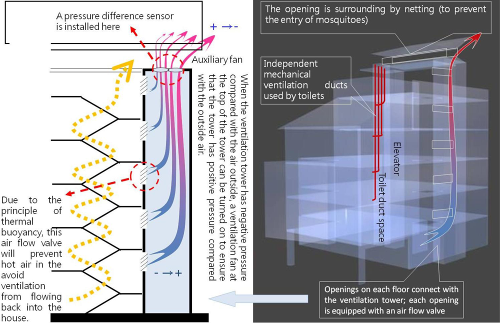 The autonomous house in this project will employ thermal buoyancy ventilation using the stairway as a ventilation tower. Due to the effect thermal buoyancy, hot air will normally enter the ventilation tower via the stairway and will escape from the top of the tower due to the effect of air flow. When external pressure is greater than indoor pressure, however, reverse air flow may occur in thermal buoyancy ventilation and hot air will be unable to escape. When pressure difference sensors and computing technology are used in conjunction with an air flow valve, if the ventilation tower has negative pressure compared with the air outside, a ventilation fan at the top of the tower can be turned on, or the angle of the air flow valve adjusted, to insure that the interior of the tower has positive pressure compared with the outside air and the hot air will be able to easily escape. Because of this, the autonomous house will use an active device to ensure that the passive thermal buoyancy ventilation tower achieves optimal ventilation performance (Figure 9) [30].