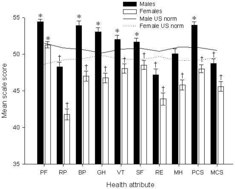 Ugandan SF-36 scores by gender. Physical Functioning (PF), Role-Physical (RP), Bodily Pain (BP), General Health (GH), Vitality (VT), Social-Functioning (SF), Role-Emotional (RE), Mental Health (MH), Physical Component Summary (PCS), Mental Component Summary (MCS). * Ugandan farm worker scale scores were significantly higher than the population norm. † Ugandan farm worker scale scores were significantly lower than the U.S. norm.