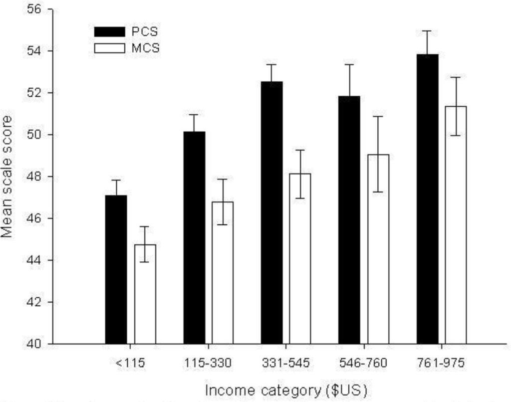 Ugandan mean health scale score by annual income class for mean Physical and Mental Component Summary scores (PCS and MCS).