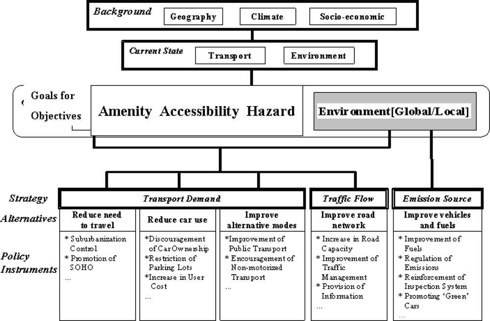 That there were so few papers relating to urbanization, transport and environmental and health impacts was somewhat surprising given the Society’s earlier initiative with a multi-disciplinary, multicountry study of transport and the environment, with the Editors achieving after much debate and argument a common conceptual understanding. Figure 1 illustrates a similar diagrammatic representation of goals, strategies and policy instruments for integrated land use and transport solutions to environmental problems in Japanese cities [24]. The World Conference on Transport Research Society (WCTRS) and the Institute of Transport Policy Studies, Tokyo used a similar conceptual model to guide research collaboration on urban transport and the environment [38].