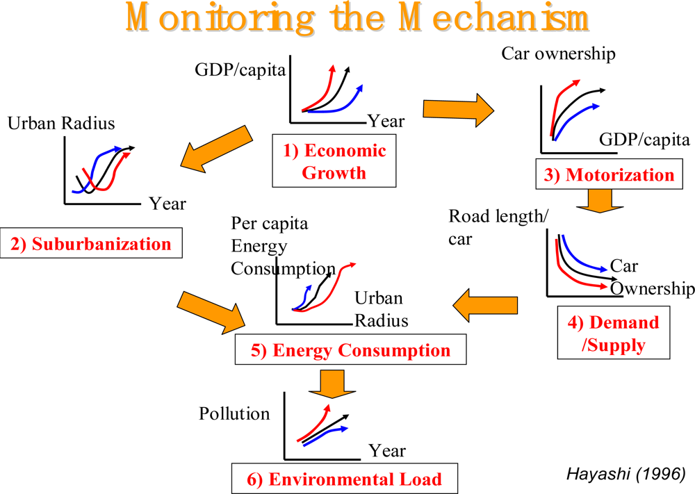 Monitoring macroscopic changes in transport and land use is a useful starting point, although transport planners would analyze detailed traffic movements and land-use change at the fine geographical detail of micro zones and consider transport pollutants at the more macro, urban level [83]. Figure 3 shows a general set of simple indicators for monitoring change are shown [84], where the blue lines are the early phases and the red lines the latest phase of urban development. In simple outline, the processes of development are driven by economic growth (income per capita) which in turn leads to increased motorization (car ownership); high road congestion levels (road length per registered car), which introduces additional air pollution. Economic growth is a driver of more residential space per person; an increasingly sprawled city (urban radius); poor accessibility with increasing spatial separation and longer journeys (total trip length). In a sprawled, car dependent city total energy consumption (and associated tail-pipe emissions) plus the carbon burden from automobile manufacture for transport is high and this is exacerbated by road congestion. That such a pattern of urban development is unsustainable has been clearly documented by numerous authors, one of who[84] is widely cited in the mainstream transport literature.