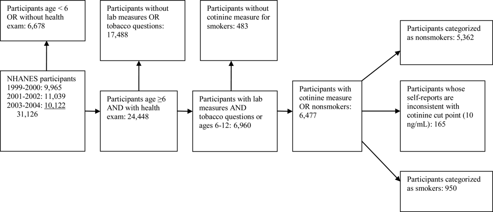 Respondents 12 years or older who answered “No” to the question, “During the past 5 days, did you use any product containing nicotine including cigarettes, pipes, cigars, chewing tobacco, snuff, nicotine patches, nicotine gum, or any other product containing nicotine” were considered nontobacco users. Any participant younger than 12 years was considered a nontobacco user, but was excluded if their cotinine was ≥ 10 ng/ml because nonsmokers in NHANES have been defined by others [40] as persons with serum cotinine < 10 ng/mL. Self-reported nontobacco users 12 years or older with a cotinine measurement ≥ 10 ng/mL were also excluded from the analyses. A nonsmoker was defined as a self-reported nontobacco user with a cotinine measurement < 10 ng/mL. Nineteen self-reported nonsmokers in the final analytic sample had cotinine levels above 10 ng/mL and were excluded.