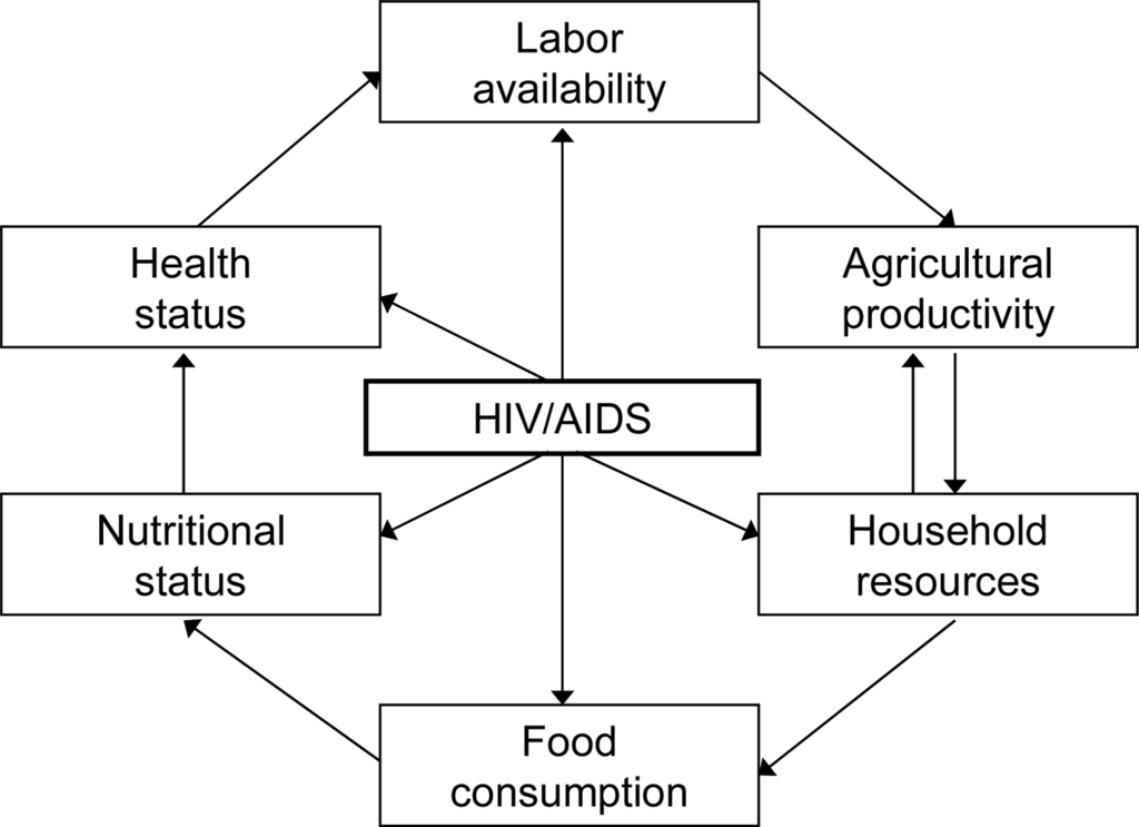 Differential vulnerability and food security effects. The range of literature reviewed demonstrates how HIV/AIDS adversely affects household living standards and how structural changes within the household system result in a loss of agricultural production. Actual household impacts will be highly dependent on (1) the age and position of the affected household member, with the death of an adult male head of household potentially having the most financial impact, and the death of an adult female negatively affecting children’s educational opportunities and participation in household labor; (2) the financial condition of the households, with poor households being much more vulnerable; (3) the type of agriculture practiced in the region; (4) the current limiting factors (land, labor, or capital) in the agricultural systems; and (5) whether formal markets for labor and agricultural outputs exist, and the extent of participation in these markets by households [6,40,61,62]. Reductions in household agricultural output and income and changes in cropping patterns can reduce household’s food security [63], reducing the nutritional quality of the diet [3], and decreasing the number of meals per day [41].