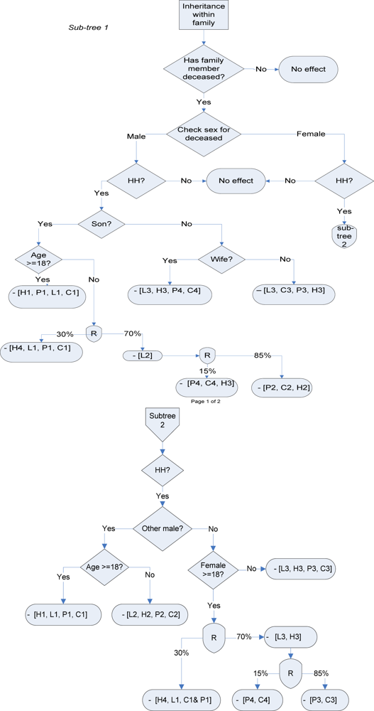 Figure 3 summarizes land transfer rules based on our qualitative interviews. As indicated earlier, one goal of this qualitative survey was to develop modified decision rules for an existing simulation model. Detailed decision trees that formalize the land and property inheritance rules in the study area were developed based on the results of the qualitative study. The flow charts identify the person designated as the new head of household and trace the transfer of household assets (land, household members, and livestock) following a household death. Sub-trees 1 and 2 illustrate rules for a male and female death, respectively. In cases in which respondents indicated that multiple outcomes were possible, we coded multiple outcomes with estimated probabilities of each. For example, in this chart, we assume a 30% chance that a remaining female will be able to keep her household assets and become the new household head. Alternately, if the assets return to her husband’s clan, we assume an 85% chance that the clan will take the remaining household members into its household, and a 15% chance that the woman will be expelled and will return to her household of origin. These assumptions could be varied in a simulation model to explore the potential effects of policy interventions aimed at strengthening the inheritance rights of women.