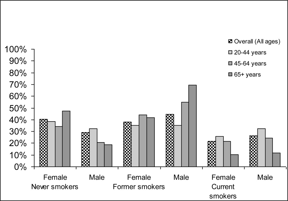Prevalence in percentage of different smoking categories by gender and age in Canada in 2002.Source: Canadian Community Health Survey (CCHS) 2003 []