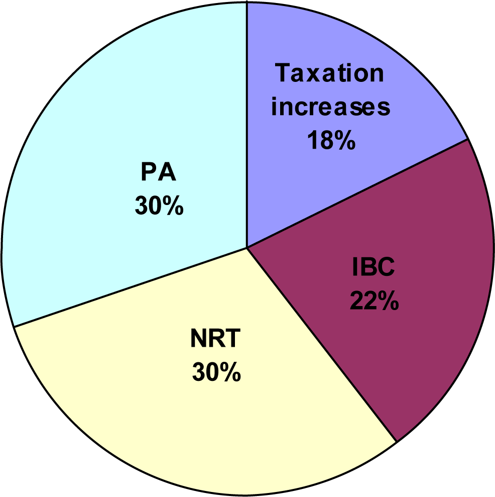 The most effective intervention in terms of avoidable burden due to morbidity was nicotine replacement therapy and physician’s advice (savings more than $11 million per each intervention, 60% of total savings), followed by individual behavioural counselling (more than $8 million per year, 22% of total savings) and increasing taxes (more than $6.5 million per year, 18% of total savings; Tables 5, 6 and Figure 2).