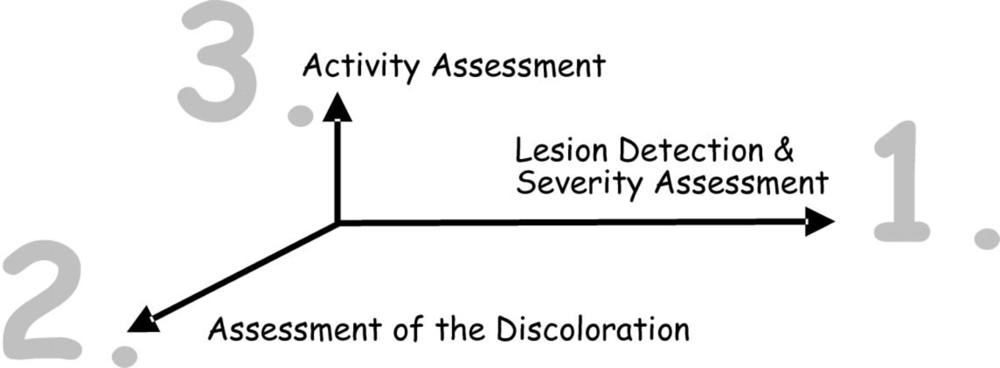 Different to existing visual systems for caries detection/diagnosis, which are essentially a sequence of criteria from ‘healthy’ to ‘severely decayed’, UniViSS uses a three-step diagnostic procedure to classify in detail the complex clinical appearance of carious lesions. These three steps are: (1) severity assessment (the severity also determines the detection level, if a caries lesion is present); (2) discoloration assessment; and (3) activity assessment. The lesion activity should be recorded as a Yes/No decision. As a whole, UniViSS can therefore be understood as a three-dimensional system of caries detection and diagnosis (Figure 1).