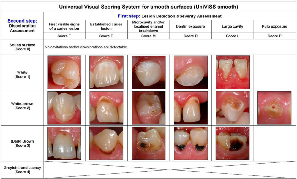 Due to the meticulous classification of all possible stages of the caries process UniViSS is able to register logically the clinical appearance of all kind of carious lesions. However, by grouping the various criteria its use can be simplified significantly, e.g., for the purpose of epidemiologists. Epidemiological studies normally require a simple and practicable procedure to ensure that the several tests can be carried out efficiently under field conditions, too. The easiest way of doing this is to group all non-cavitated lesions under the same category (Scores F, E, M) apart from registering the cavitated caries lesions (Scores D, L, P = D-component of the DMF index) and to record them as one score for the respective tooth or surface. Thus, any carious processes that can at least be observed visually will be captured. Although it requires more effort, each of the three diagnostic steps mentioned above (1. severity assessment, 2. discoloration assessment, and 3. activity assessment) may also be included in the study design. In order to ensure the reproducibility of the results the teeth should be cleaned and the examiner(s) should have received a calibration training prior to the study.