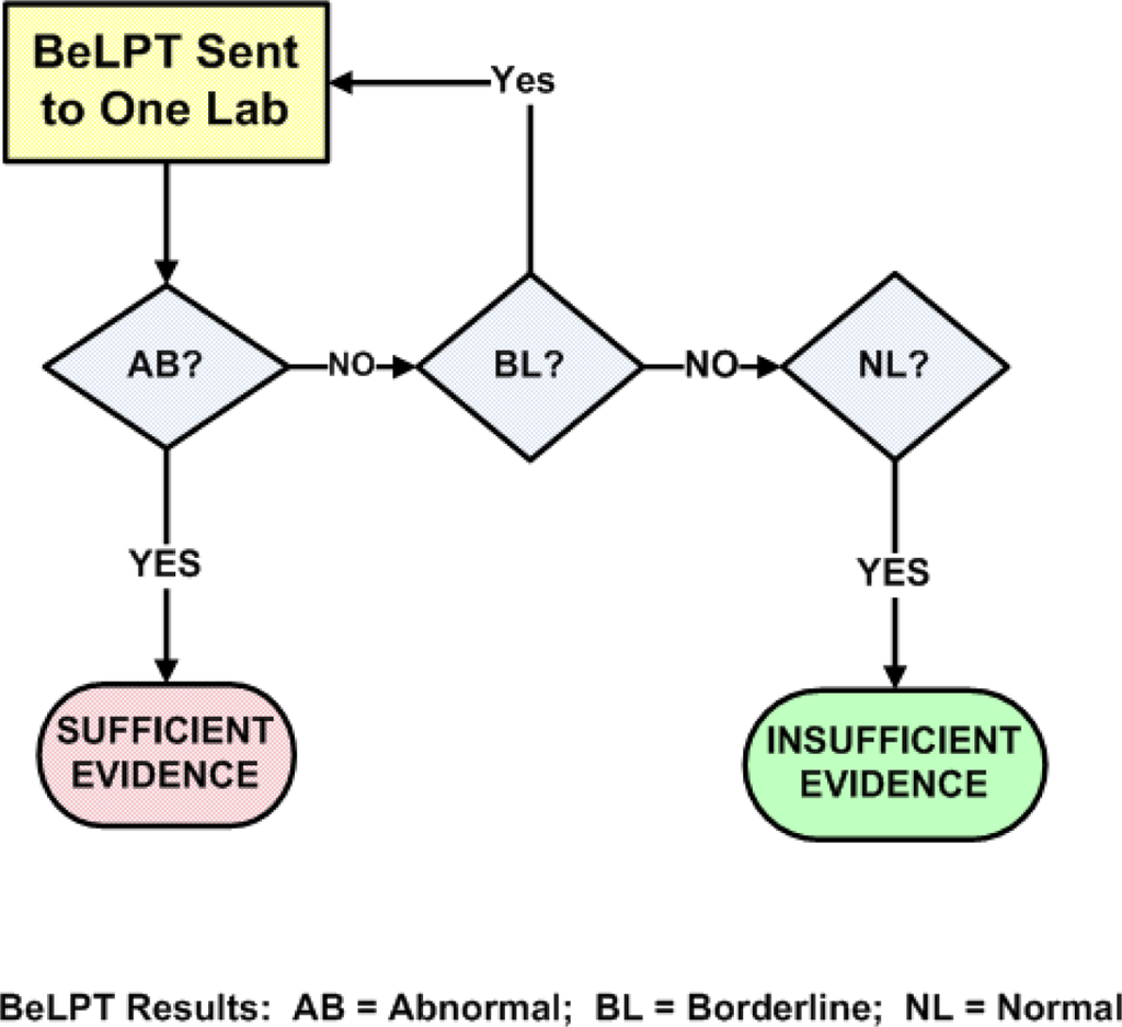 Finally, the NRC noted that current practice is not always strictly limited to a specific algorithm, but considers results collected at various times over long time periods. For example, one abnormal BeLPT result that is followed first by two normals and then later by another abnormal, is considered equivalent to two sequential abnormals and the individual is referred for evaluation. The committee acknowledged some uncertainty, but suggested that the current approach continue until data is available to clarify the impact of such practices.