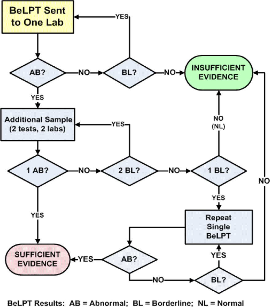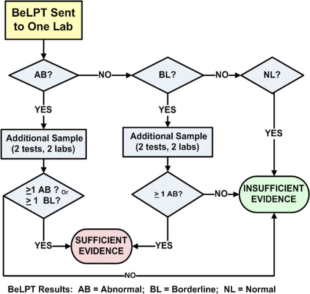 The algorithm recommended to the Air Force was taken from the article by Middleton et al. [15]. This algorithm is based on the criteria of “one abnormal plus one borderline.” Citing Stange et al. [16] and Middleton et al. [15,17], the NRC committee also advised consideration of the prevalence of BeS in the population being tested.