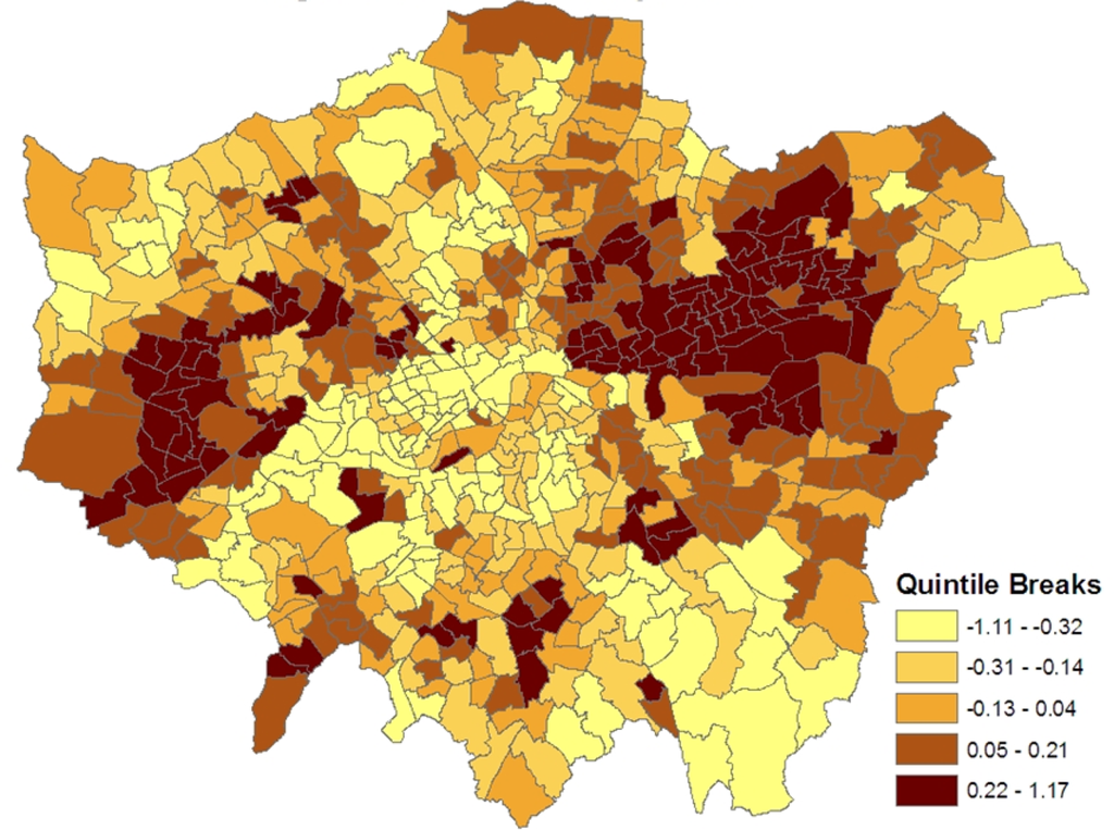 The estimated k coefficients in Table 2 indicate a high spatial correlation in the latent CHD morbidity index under both models. The estimated βl parameters from the multiple cause regression (3) show income differences between wards to be the most important known influence on the index, though concentrations of south Asian ethnic groups are also important. As expected, higher income levels are negatively associated with morbidity (so the 95% interval for the coefficient β1 is confined to negative values). The importance of area socioeconomic status to CHD outcomes is confirmed by other studies [24,25].