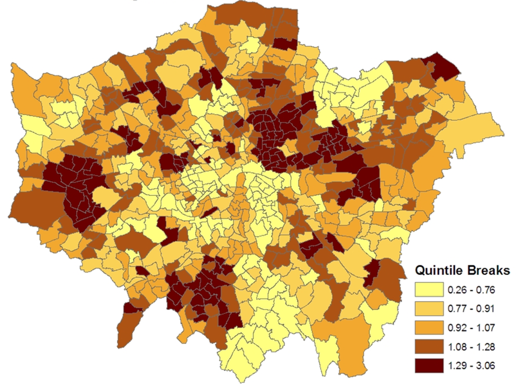 Figure 1 shows the spatial patterning of the CHD morbidity scores in model 1, higher values are in inner east (though not central) London and in certain parts of west London. Figure 2 maps the estimated ward level prevalences in terms of relative risks under the constrained model 1, namely the posterior means of ξj = zj/Ej. For policy purposes, the probability that a small area has significantly higher relative risk and thus possibly needs special resources is important. Therefore the marginal variance ω2 = var(ξj) is monitored during the MCMC run, and the standardized relative risks (SRRs)