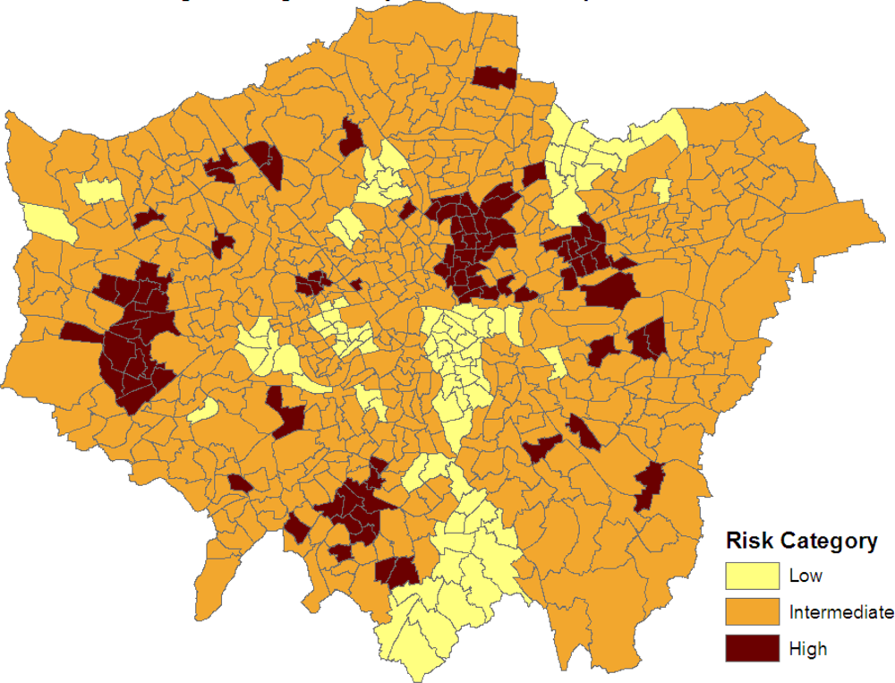 As demonstrated in Figure 3, one application of the modelling scheme is to highlight small areas with significantly elevated prevalence. This is important for prioritizing resourcing and intervention, and is based on a method that seeks to make use of all relevant information (comorbid outcomes, area social structure, and the spatial configuration of small areas). By contrast, many other health needs measures used to distribute resources are based simply on socioeconomic variables (e.g., the Jarman score) [28], or on regressions of single health indicators (e.g., hospitalizations) on socioeconomic variables [29], when multiple indicators may in fact be relevant. Existing methods also neglect spatial clustering in unobserved risk factors.