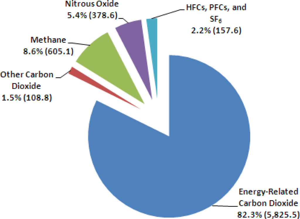 U.S. anthropogenic greenhouse gas emissions by gas in 2006 (million metric tons of carbon dioxide equivalent) (graph modified from [2]).