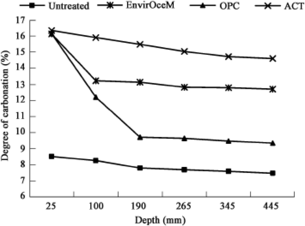 Four cell types of soil sample were used: untreated soil, EnvirOceM (proprietary environmental cement) soil, OPC (ordinary Portland cement) soil, and ACT (accelerated carbonation technology) soil. Compared with the traditional cement-based soils, ACT greatly increased the plastic limit (PI (%): potential water content range at which the soil becomes plastic) or density of the treated soil and made PI more stable in the long-term weathering. The increase sequence of PI according to the soil depth is shown in Figure 11: untreated soil > ACT soil > OPC soil > EnvirOceM soil, and also the degree of carbonation in Figure 12: ACT soil > EnvirOceM soil > OPC soil > Untreated soil [38].
