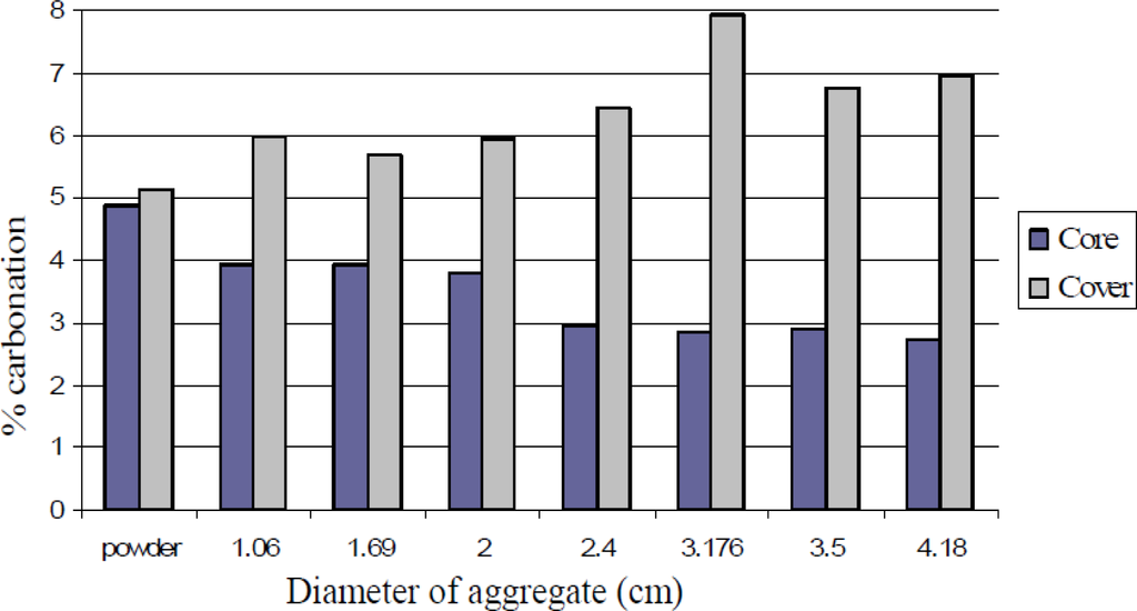 In addition, a study on producing artificial aggregates from contaminated soil by the accelerated carbonation was performed in USA [37]. In the study, the artificial aggregates were created by mixing soil, water and Portland cement in CO2 rich atmosphere, similar to the case using alkaline wastes mentioned in the section “3.1”. Then, around 90–95 % aggregates fall under gravel category (≥4.75 mm) as shown in Figure 13. The study also reported that an increase in diameter of aggregate resulted in a decrease in the diffusion of CO2 in the core (see Figure 14) [37].